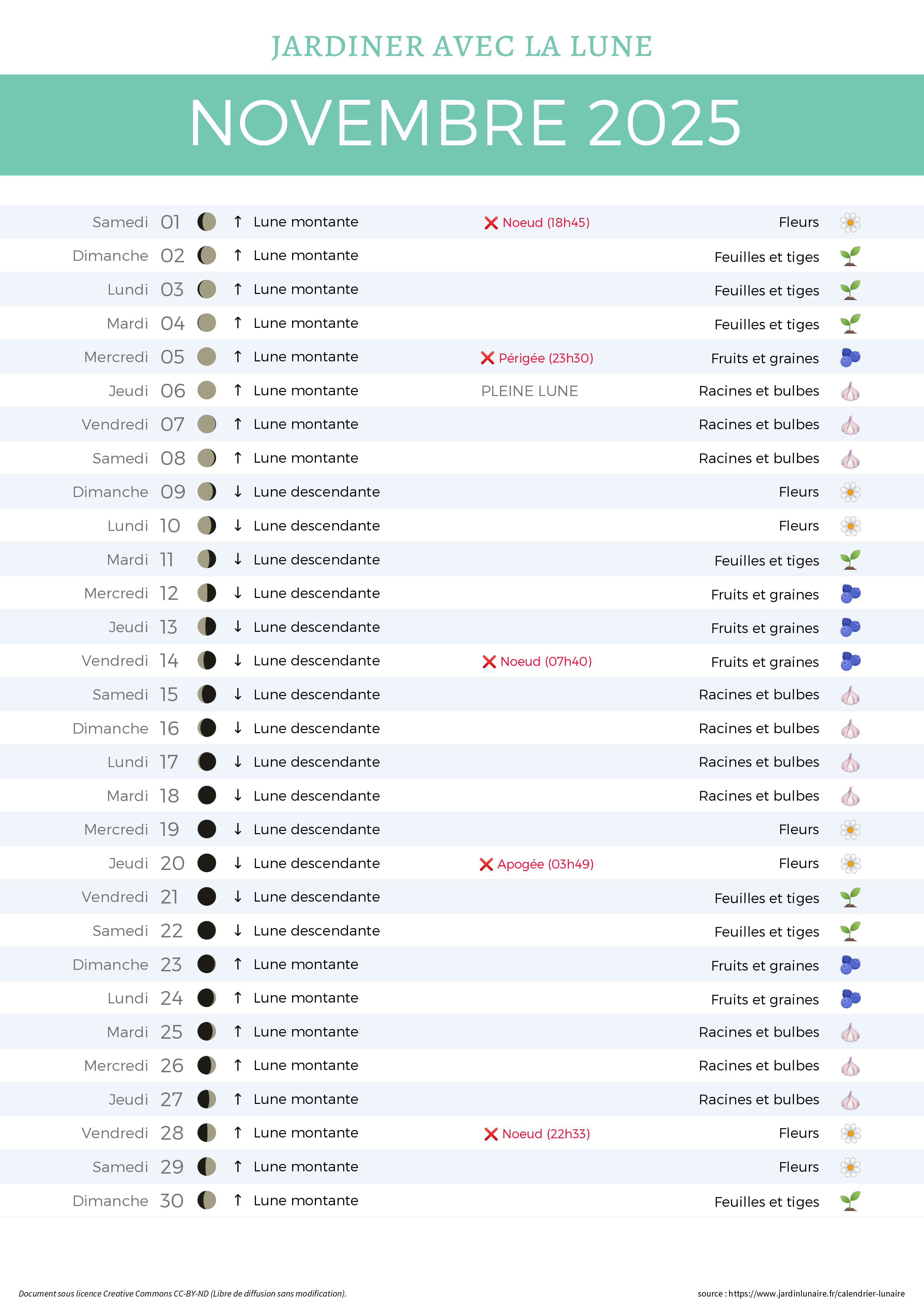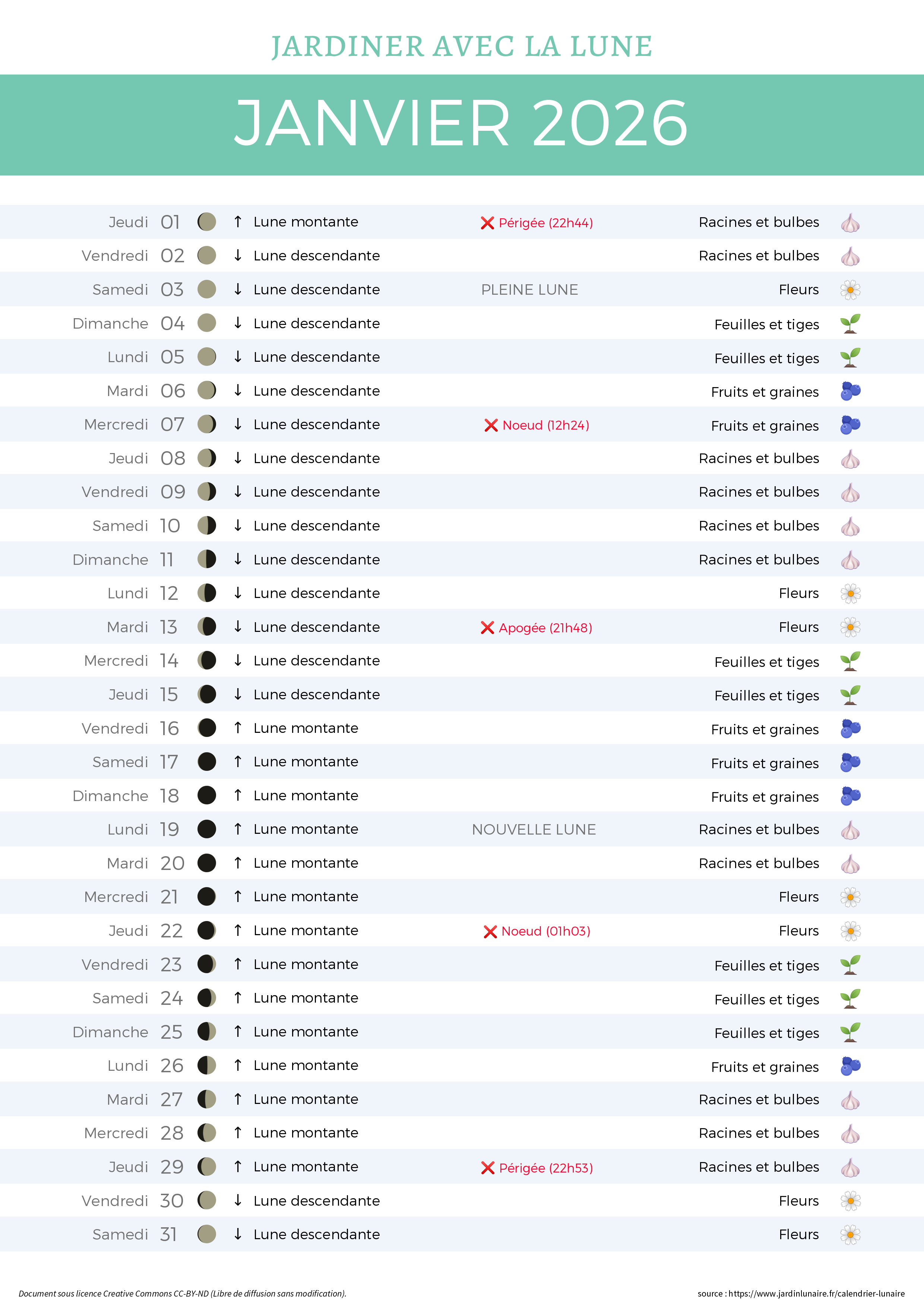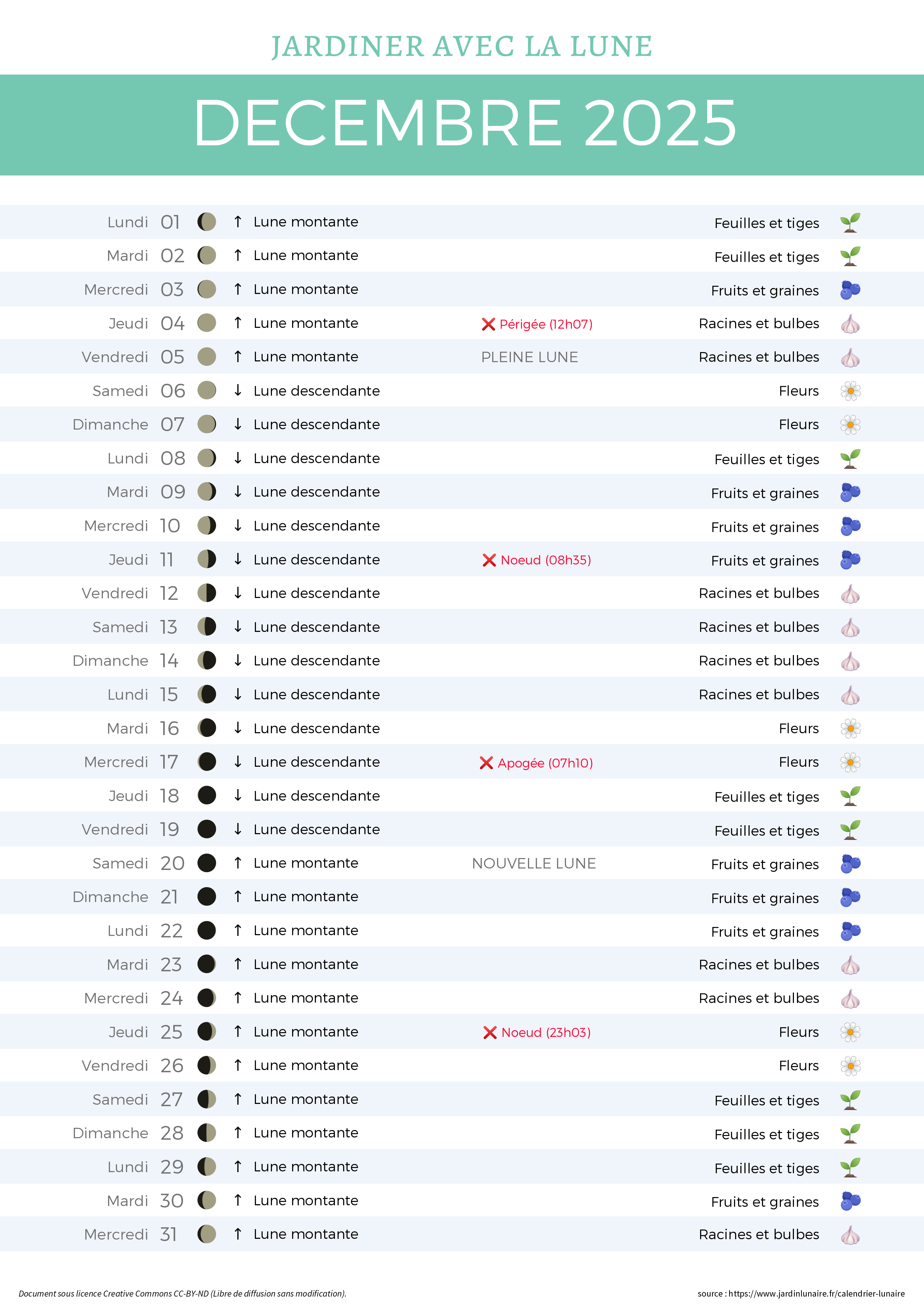 Le calendrier lunaire - actualisé de manière journalière - comprend toutes les informations utiles pour jardiner avec la lune : La déclinaison, le type de jour, les périodes à éviter (nœuds lunaire, périgées et apogées). Accédez aussi sur cette page aux calendriers lunaires à télécharger.