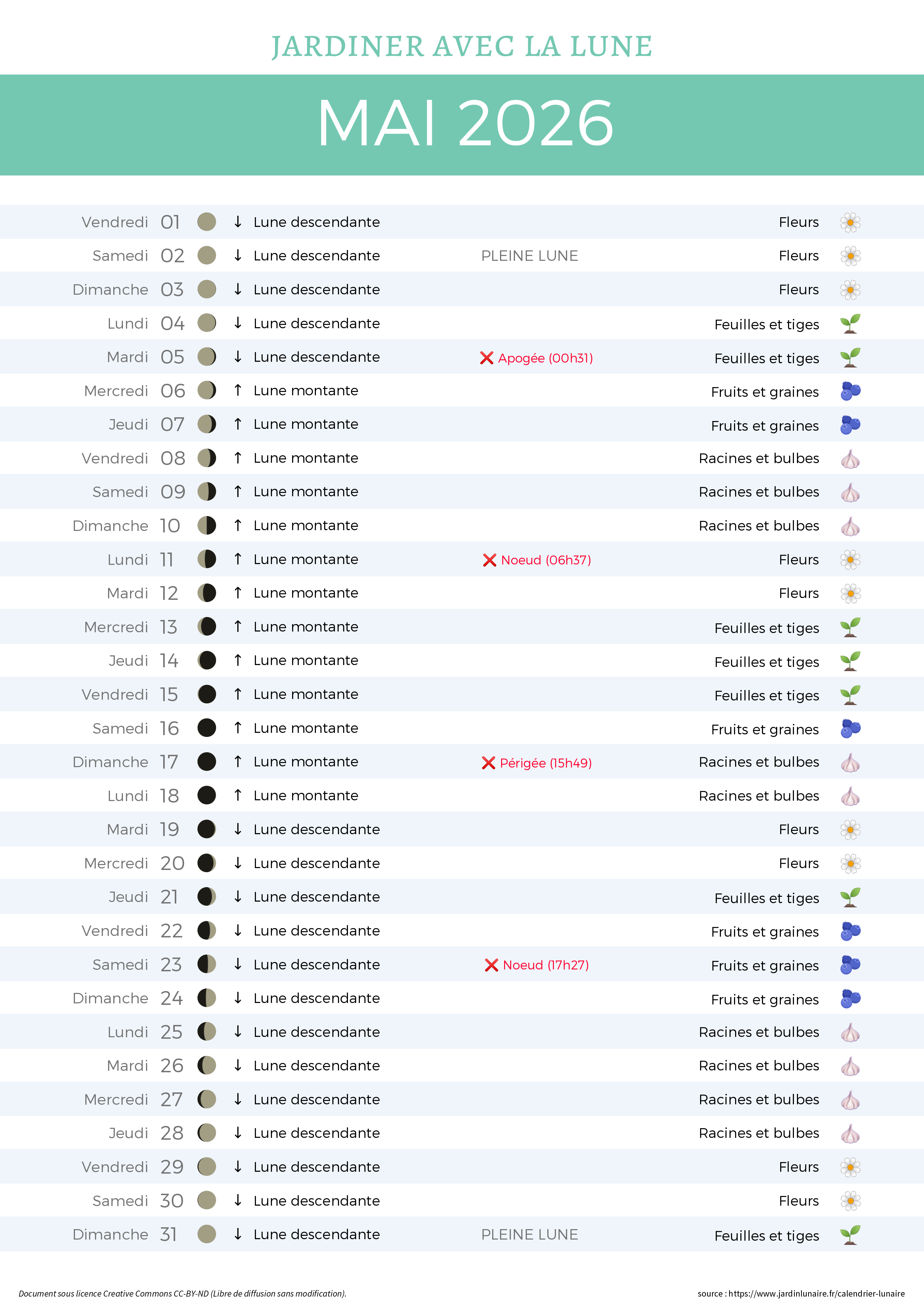 | Vendredi 15 | 🌘 | ↑ Lune montante | 🌱 Feuilles |